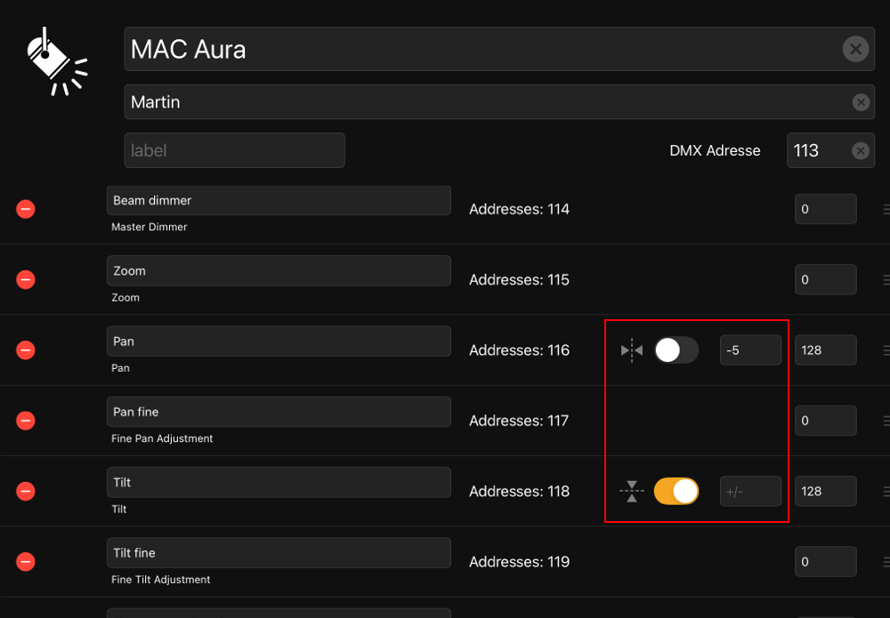 In Edit Mode within the fixture details, you can enter correction values (for example Tilt -5) to compensate for mounting positions, mechanical offsets, or mirrored installations.