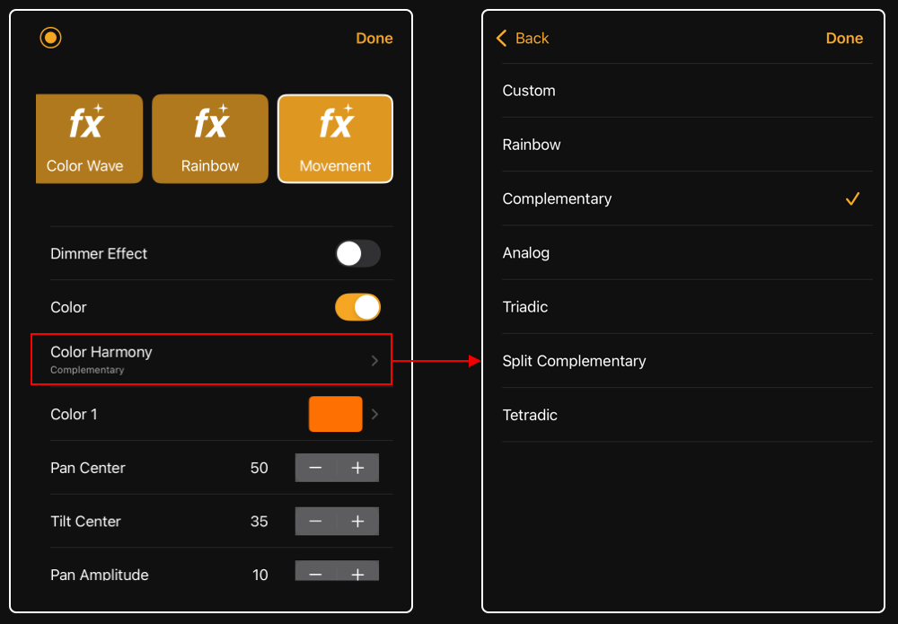 - Color Effects now support color harmonies such as complementary, analogous, triadic, tetradic, and monochromatic, and can be combined with dimmer effects.