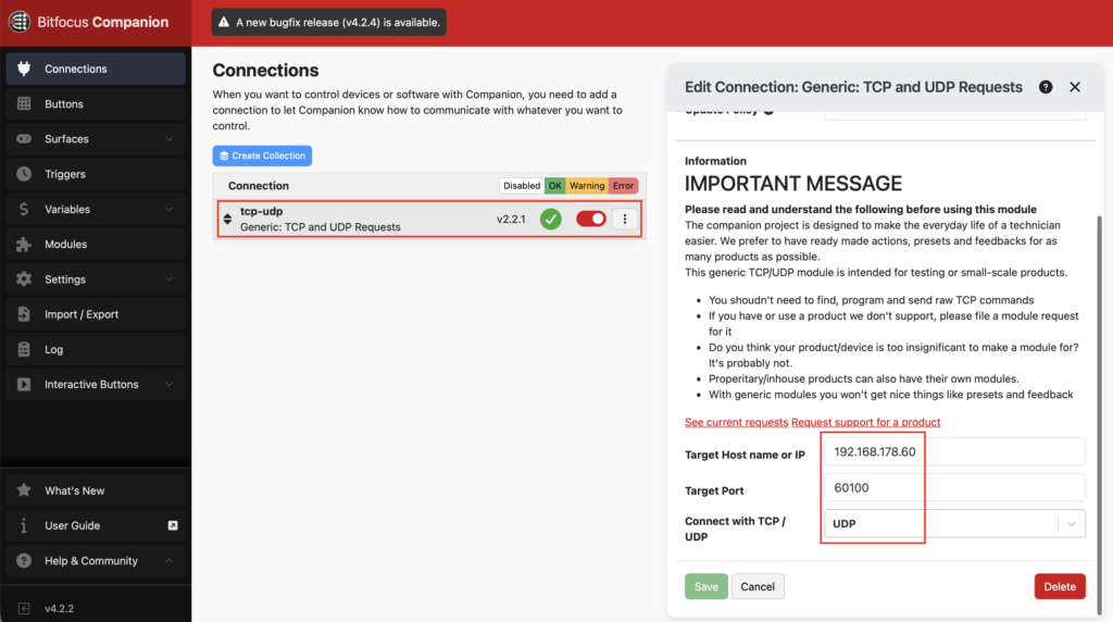 In Companion, you’ll need to set up a Generic UDP Module:
